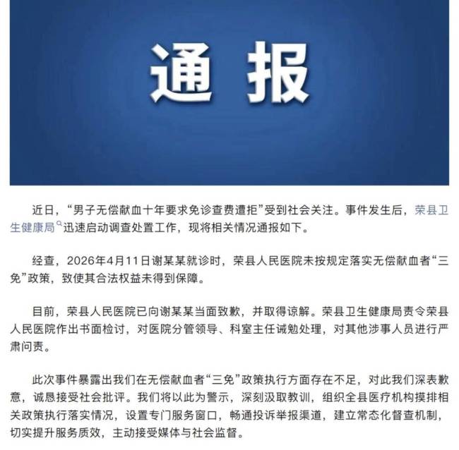 媒体:莫凉英雄血莫欺行善人 政策落实不应打折 关键词: 2026-04-16 09:16:44  搜狐网 媒体:莫凉英雄血莫欺行善人 政策落实不应打折。近日,一位献血英雄的“一腔热血”遭遇了挫折。四川自贡市民谢先生坚持无偿献血十年,累计献血近4万毫升,按政策可申领“博爱卡”免交公立医疗机构普通门诊诊查费。然而,他在荣县人民医院使用该权益时却遇阻。4月14日,荣县卫生健康局发布情况通报,已向谢先生当面致歉,并取得谅解,对涉事人员也已作出处理。谢先生十年间献血109次,总量近4万毫升,挽救了无数生命。相比之下,十几元的普通门诊费显得微不足道,却被一句“根本不知道这个政策”轻易拒绝。这不仅反映出医院对政策落实力度的不足,也折射出城市对待奉献者的态度问题。问题曝光后,当地卫健局迅速道歉并处理涉事人员,态度值得肯定。但还需追问:这仅是个别工作人员对政策不熟悉,还是制度落地存在障碍?如果谢先生不发声、媒体不报道,他的“博爱卡”是否还会继续“沉睡”?给予献血者免去诊查费的优待,本是象征性的尊重和感谢。如果连这种最基本的情感激励都要靠献血者自己争取,那优待岂不是变成了徒增烦恼的“包袱”?以后再呼吁市民踊跃献血时,又何来底气?现实中,类似事件并非孤例。许多地方在政策落实中存在形式主义倾向。政策颁布了,但停留在纸面上;文件下发了,但基层人员执行意识未到位。说到底,惠民政策的初衷应是让老百姓尝到实实在在的好处,而不是仅仅记录在案。政策善意若总卡在执行环节,难免让公众产生“中看不中用”的印象。细节落实和贯彻执行比出台政策更考验治理能力,更能聚拢人心,因为它彰显的是“说到做到”的魄力与决心。通报发布后,谢先生表示对处理结果满意,以后仍会继续坚持献血。英雄可以不计较,这是他的胸怀与格局,但社会不能不当回事,这是我们的责任与反思。制度善意应通过落地执行完成闭环,不要让执行受阻浇灭英雄乐于奉献的热情。 (责任编辑:0882)